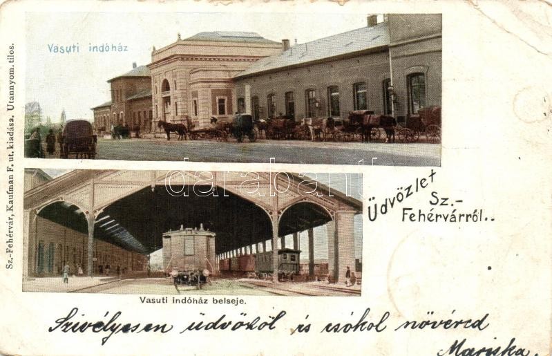 Beschreibung: Székesfehérvár, Vasútállomás, indóház, faszerkezetes váró vonatokkal. Kaufmann F. kiadása (EB)