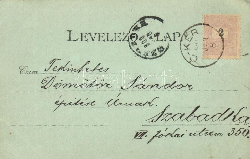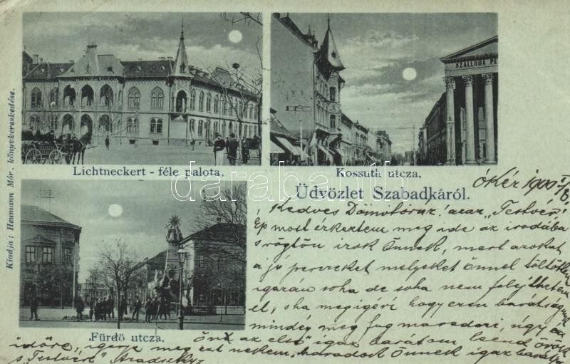 1900 Szabadka, Subotica; Kossuth és Fürdő utca, Lichtneckert-féle palota, Szálloda Pest városához, este, Szentháromság szobor / streets, palace, hotel, statue, night view (EK)
