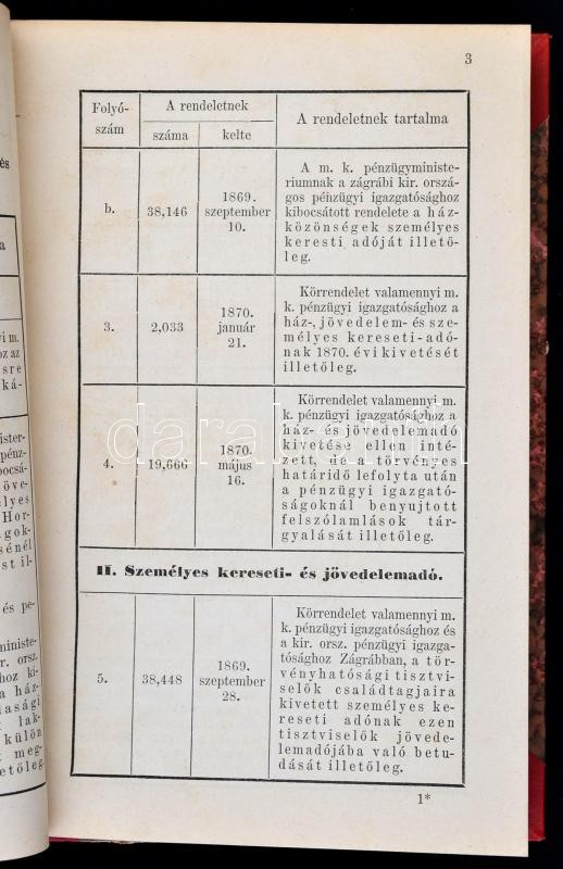 A magyar királyi pénzügyministerium rendeletei és utasításai a személyes kereseti-, jövedelem- és házadó tárgyában. Hivatalos kiadás. 1870. évi 44.634. PM. számhoz. Buda, 1870, Magyar Királyi Államnyomda, 2+120 p. Átkötött félvászon-kötés, jó állapotban.