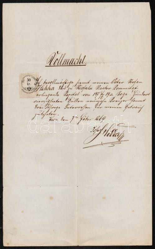 Beschreibung: 1855, 1866 A nezsideri laktanya munkálataival kapcsolatos hozzájárulásokkal foglalkozó 3 db okmány, okmánybélyegekkel(50kr, 15kr C.M., 30kr C.M.)