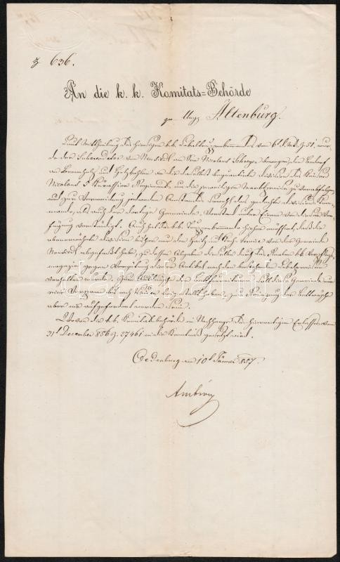 1857 Sopron, A mosonmagyaróvári császári királyi vármegyei hatóságnak ... https://www.darabanth.com/de/290-Fernauktion/290.0/Andere-Sammelgebiete/Dokument~100017/1857-Sopron-A-mosonmagyarovari-csaszari-kiralyi-varmegyei-hatosagnak-cimzett-level-Ambro~II1531605
