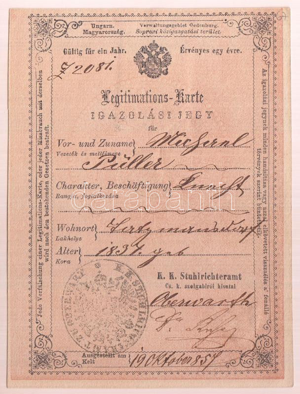 1859 Német és magyar nyelvű igazolási jegy 6 kr C.M. okmánybélyeggel, ... https://www.darabanth.com/de/290-Fernauktion/290.0/Andere-Sammelgebiete/Dokument~100017/1859-Nemet-es-magyar-nyelvu-igazolasi-jegy-6-kr-CM-okmanybelyeggel-KK-Stuhlrichteramt-be~II1469583