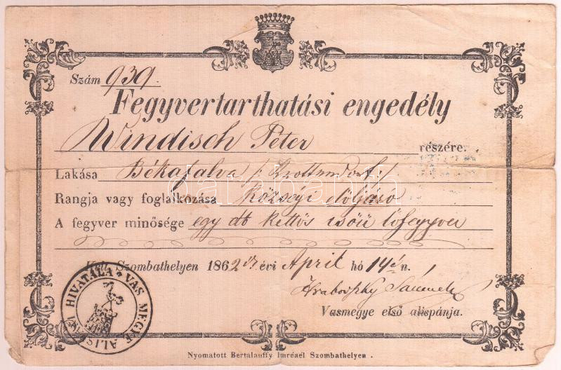 1862 Fegyvertartási engedély békafalvi lakos, községi elöljáró részére... https://www.darabanth.com/de/290-Fernauktion/290.0/Andere-Sammelgebiete/Dokument~100017/1862-Fegyvertartasi-engedely-bekafalvi-lakos-kozsegi-eloljaro-reszere-72kr-illetekbelye~II1496853