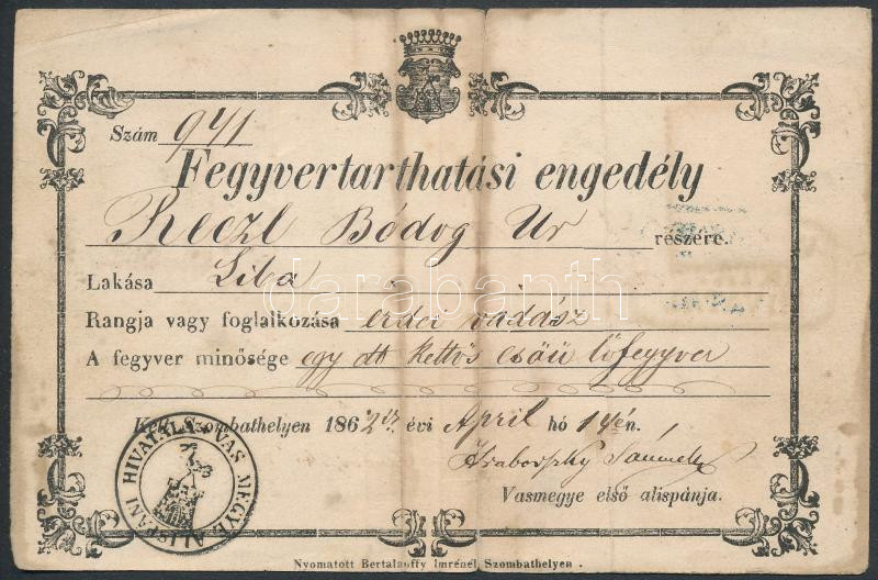 1862 Fegyvertarthatási engedély libai lakos, erdei vadász részére 72kr... https://www.darabanth.com/de/290-Fernauktion/290.0/Andere-Sammelgebiete/Dokument~100017/1862-Fegyvertarthatasi-engedely-libai-lakos-erdei-vadasz-reszere-72kr-illetekbelyeggel-186~II1519035