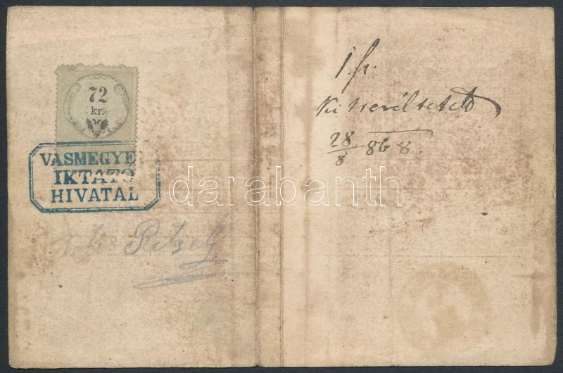 Beschreibung: 1862 Fegyvertarthatási engedély libai lakos, erdei vadász részére 72kr illetékbélyeggel / 1862 Gun licence for Burgenland Leibau village hunter, with tear