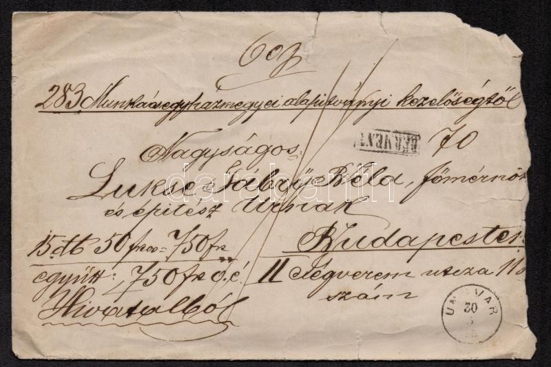 Beschreibung: 1876 Munkácsegyházmegyei alapítványi kezelőség levele Lukse-Fábry Béla (1844-1915) főmérnök, építész részére, Ungvár, a borítékkal, a borítékon az egyházmegyei alapítvány 5 viaszpecsétjével.