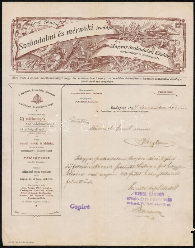 1894 Bergl Sándor Szabadalmi és Mérnöki irodája és a Magyar Szabadalmi... https://www.darabanth.com/de/290-Fernauktion/290.0/Andere-Sammelgebiete/Dokument~100017/1894-Bergl-Sandor-Szabadalmi-es-Mernoki-irodaja-es-a-Magyar-Szabadalmi-Kozlony-szerkesztosC3~II1527672