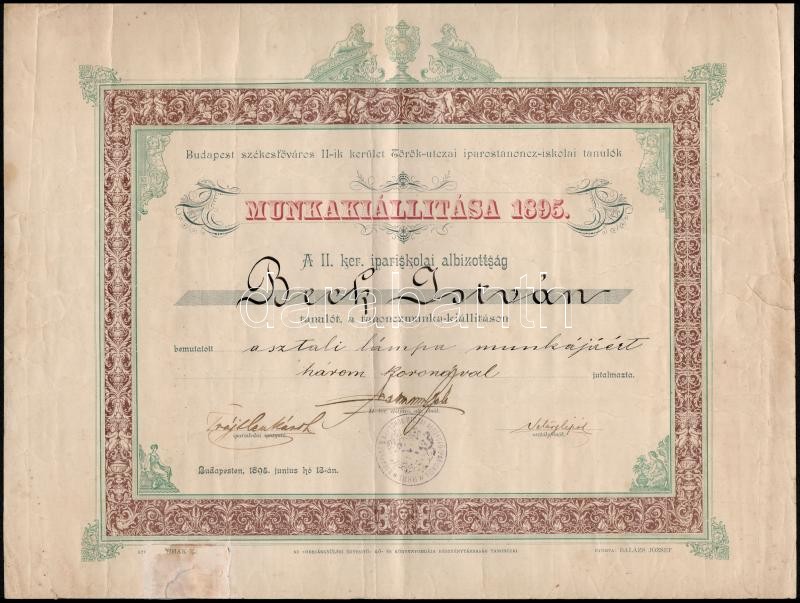 1895 Bp., a II. kerületi Török utcai iparostanonc iskola oklevele isko... https://www.darabanth.com/de/290-Fernauktion/290.0/Andere-Sammelgebiete/Dokument~100017/1895-Bp-a-II-keruleti-Torok-utcai-iparostanonc-iskola-oklevele-iskolai-tanoncmunka-versenyen-e~II1528749