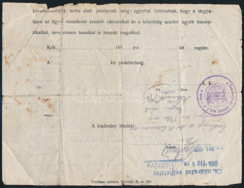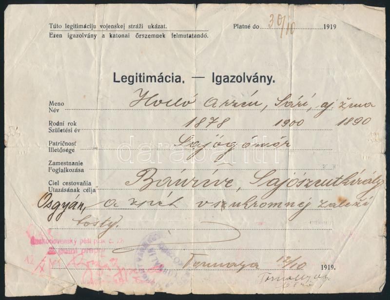1919 Igazolvány, a csehszlovák hatóságok által kiállítva, utazási célra, Bánréve, Osgyán, Sajószentkirály uticélokra jogosítva, pecsétekkel, kissé viseltes állapotban.