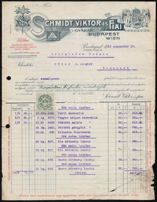 1919 Schmidt Viktor és Fiai gyárának díszes, fejléces számlája, 10 fil... https://www.darabanth.com/de/290-Fernauktion/290.0/Andere-Sammelgebiete/Dokument~100017/1919-Schmidt-Viktor-es-Fiai-gyaranak-diszes-fejleces-szamlaja-10-filleres-illetekbelyegg~II1527647