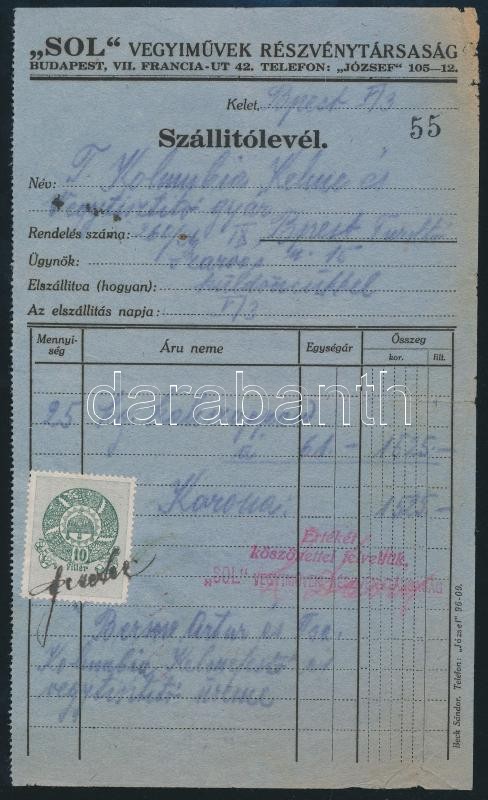 Beschreibung: 1920 "SOL" Vegyiművek részvénytársaság szállítólevél 10f okmánybélyeggel
