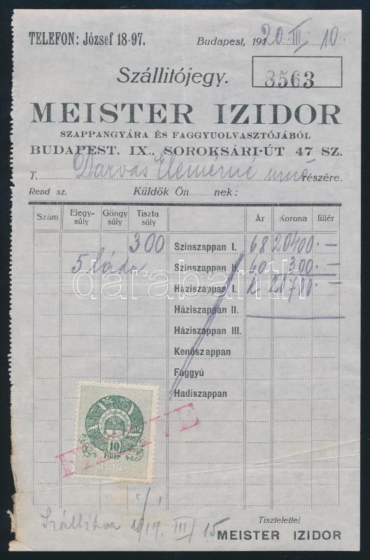 1920 Szállítójegy Meister Izidor szappangyára és faggyúolvasztójából 1... https://www.darabanth.com/de/290-Fernauktion/290.0/Andere-Sammelgebiete/Dokument~100017/1920-Szallitojegy-Meister-Izidor-szappangyara-es-faggyuolvasztojabol-10f-okmanybelyeggel~II1529433