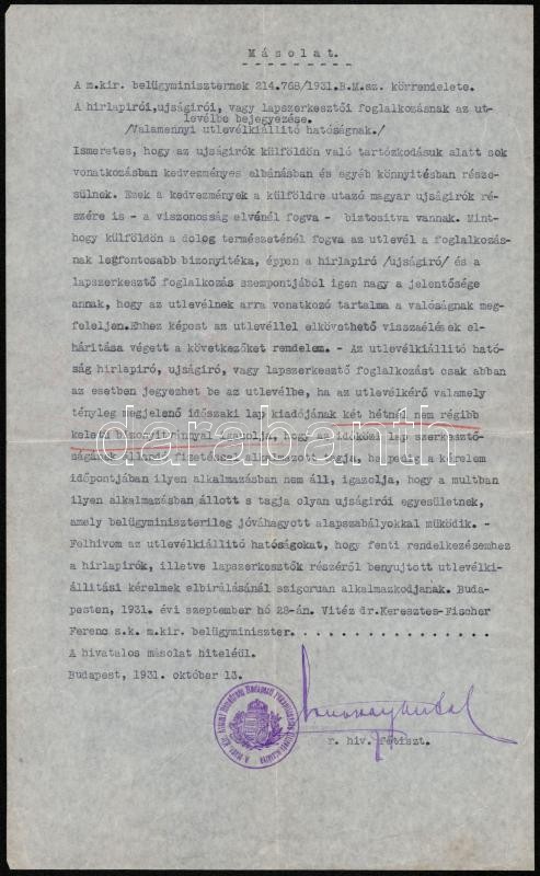Beschreibung: 1931 A magyar királyi belügyminiszter körrendelete hÃrlapÃrói, újságÃró, lapszerkesztÅ‘i foglalkozás útlevélbe bejegyzésérÅ‘l. RendÅ‘rség útlevél osztály bélyegzÅ‘vel, fÅ‘tiszt aláÃrásával, 34x20 cm