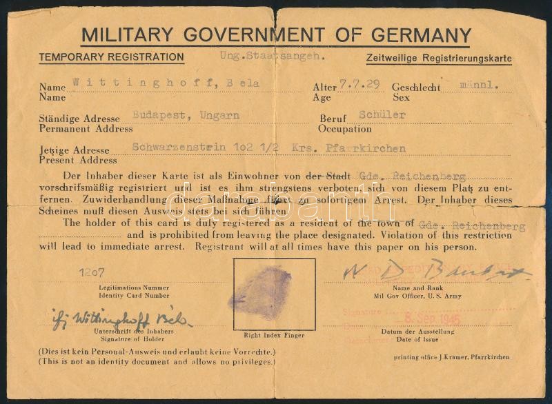 1945 Ideiglenes nyilvántartásba vételi igazolvány, Németország Katonai Kormányzata, Pfarrkirchen, megviselt állapotban, a hajtások mentén szakadásokkal, német nyelven./ 1945 Temporary registration, Military Government of Germany, Pfarrkirchen, in poor condition, in german language.