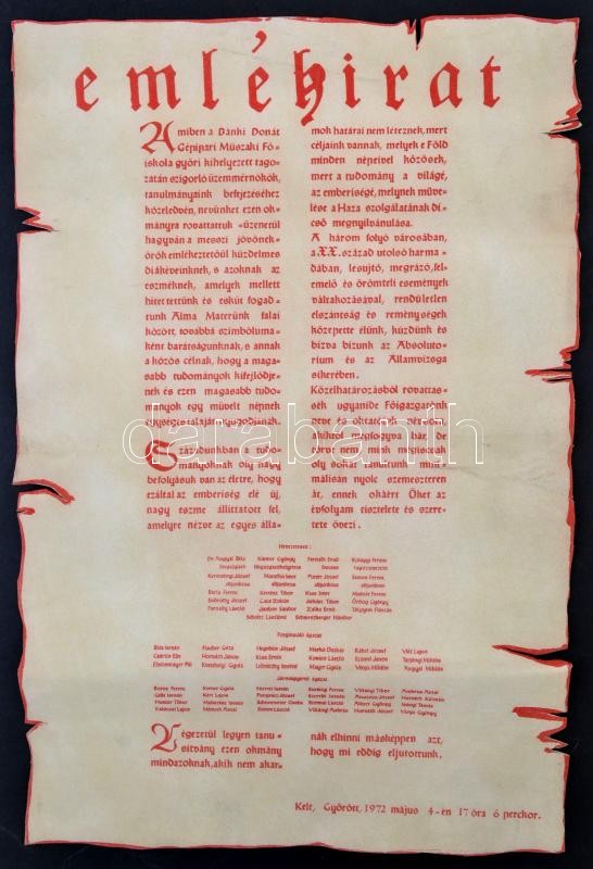 Beschreibung: 1972 A Bánki Donát Gépipari Műszaki Főiskola győri kihelyezett tagozatának emlékirata, filcre nyomtatva, 47x31 cm