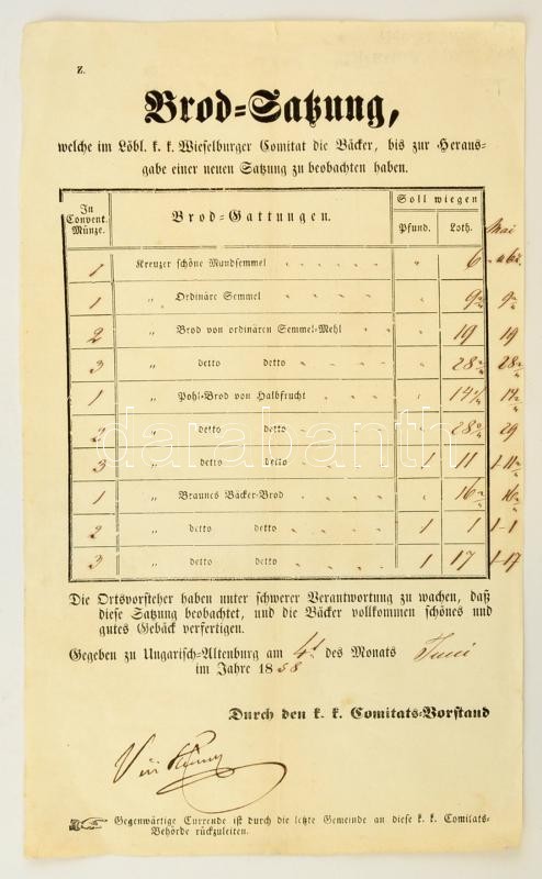 1858 Mosonmagyaróvár, Vármegyei hivatal által kiadott kenyérárszabás https://www.darabanth.com/de/290-Fernauktion/290.0/Andere-Sammelgebiete/Drucksachen~100028/1858-Mosonmagyarovar-Varmegyei-hivatal-altal-kiadott-kenyerarszabas~II1531843