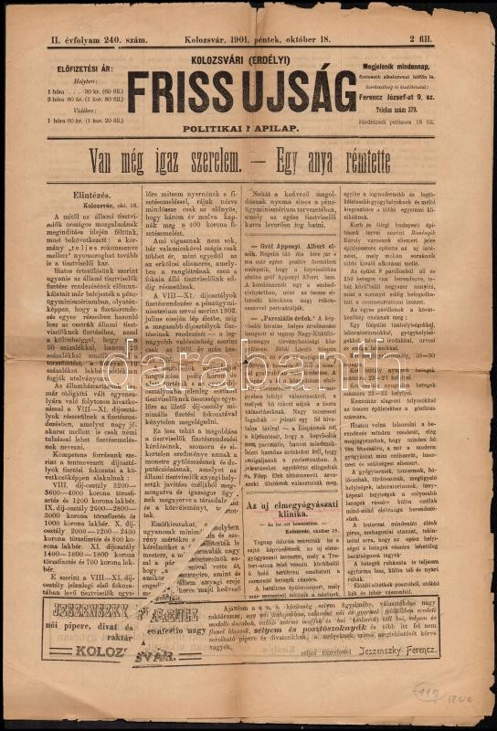 Beschreibung: 1901 Kolozsvár, A kolozsvári Friss Újság politikai napilap II. évfolyamának 240. száma