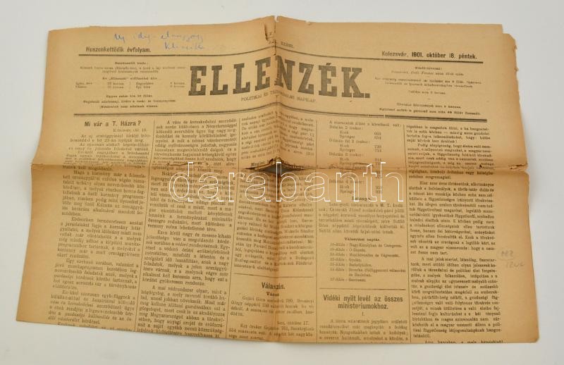 1901 Kolozsvár, Az Ellenzék című politikai és társadalmi napilap 22. é... https://www.darabanth.com/de/290-Fernauktion/290.0/Andere-Sammelgebiete/Drucksachen~100028/1901-Kolozsvar-Az-Ellenzek-cimu-politikai-es-tarsadalmi-napilap-22-evfolyamanak-238-szam~II1531270