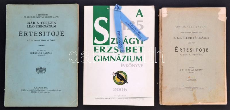 1906-2006 Vegyes iskolai értesítők, 3 db: 1906 Az Erzsébetvárosi bentlakással összekötött M. Kir. Állami Főgimnázium XV. évi értesítője az 1905-6. tanévről. Szerk.: Laukó Albert. Erzsébetváros, 1906, Scholtes Albert Könyvnyomdája. Kiadói papírkötés, széteső állapotban. 1933 A Budapesti VI. kerületi Magyar Királyi Állami Mária Terézia Leánygimnázium értesítője az 1932-1933. iskolai évről. Szerk.: Bernolák Kálmán. Bp., 1933, Kiadta az Iskola Igazgatósága. 2006 A 125 éves Szilágyi Erzsébet Gimnázium évkönyve. Szerk.: Tamás Ferenc, Tóth Attila.