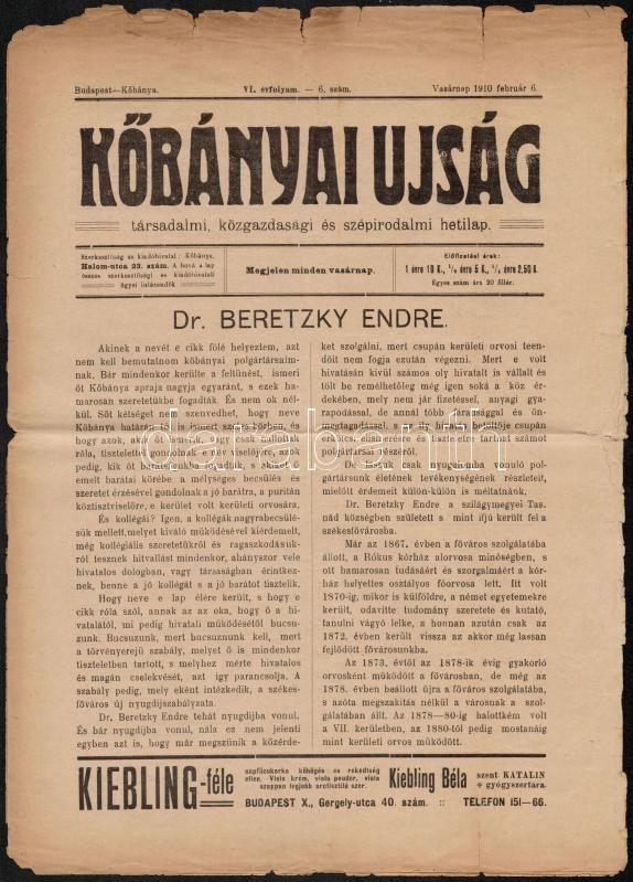 1910 Kőbányai Ujság, 1910. február 6., VI. évf. 6. szám, kissé viselte... https://www.darabanth.com/de/290-Fernauktion/290.0/Andere-Sammelgebiete/Drucksachen~100028/1910-Kobanyai-Ujsag-1910-februar-6-VI-evf-6-szam-kisse-viseltes-szakadozott-allapot~II1528453