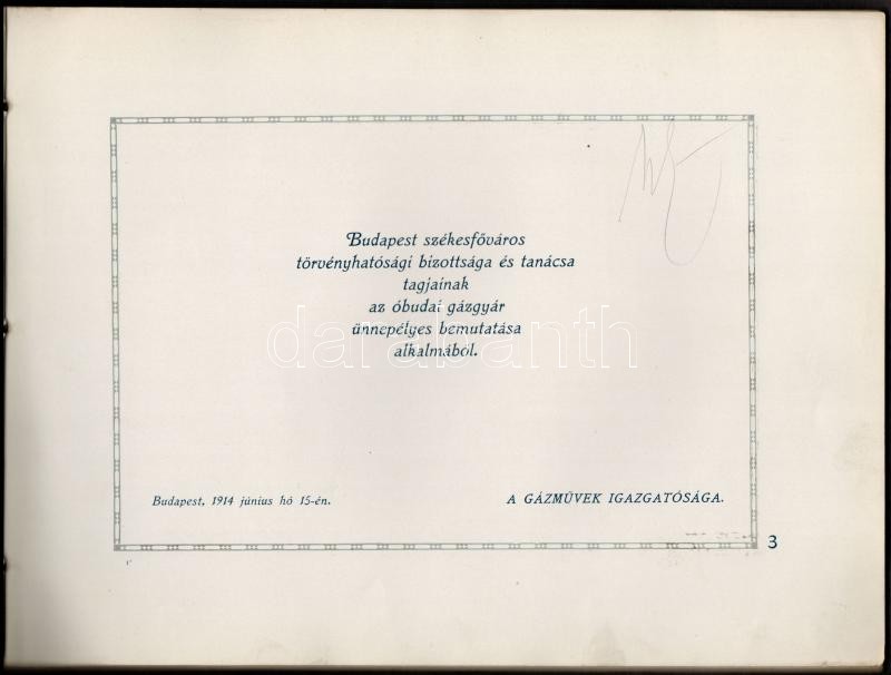 1914 Budapest Székesfőváros Gázművei. Budapest székesfőváros törvényhatósági bizottsága és tanácsa tagjainak az óbudai gázgyár ünnepélyes bemutatása alkalmából. 1914. Június 15-én. Bp., 1914, Hornyánszky Viktor, 59+4 p. Kiadói zsinórral füzött harántalakú papírkötés, számos fekete-fehér és szövegközti fotóval illusztrálva, megviselt állapotban, az elülső borító és a kihajtható melléklet hiányzik.