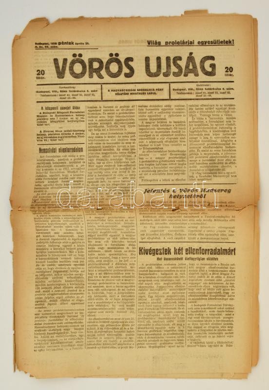 1919 Vörös Ujság 1919. április 25., II. évf., 66. szám, megviselt, sza... https://www.darabanth.com/de/290-Fernauktion/290.0/Andere-Sammelgebiete/Drucksachen~100028/1919-Voros-Ujsag-1919-aprilis-25-II-evf-66-szam-megviselt-szakadozott-allapotban~II1528096