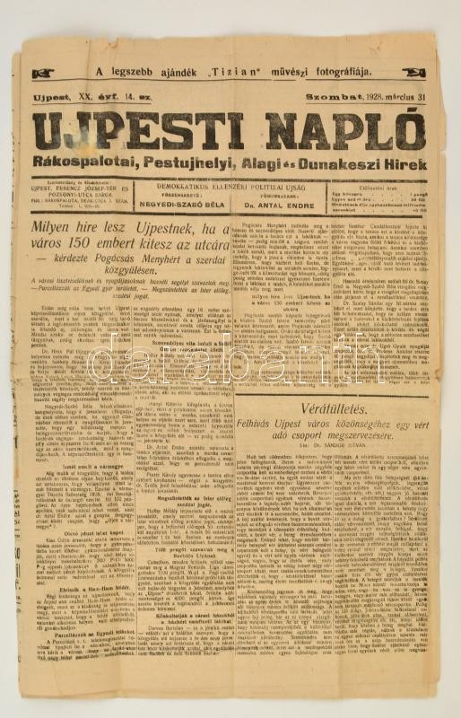 1928 Ujpesti Napló, 1928. március 31., XX. évf. 14. sz., Szerk.: Negye... https://www.darabanth.com/de/290-Fernauktion/290.0/Andere-Sammelgebiete/Drucksachen~100028/1928-Ujpesti-Naplo-1928-marcius-31-XX-evf-14-sz-Szerk-Negyedi-Szabo-Bela-kisse-fol~II1528407