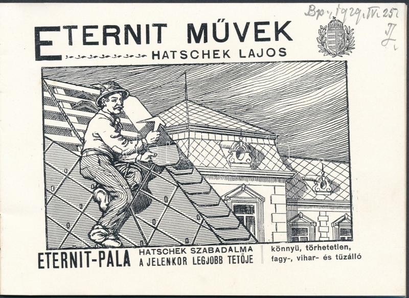 1929 Hatschek Lajos Eternit művek rajzos reklámfüzet. 16p. Dombor címe... https://www.darabanth.com/de/290-Fernauktion/290.0/Andere-Sammelgebiete/Drucksachen~100028/1929-Hatschek-Lajos-Eternit-muvek-rajzos-reklamfuzet-16p-Dombor-cimerrel-jo-allapotban-16x~II1532871