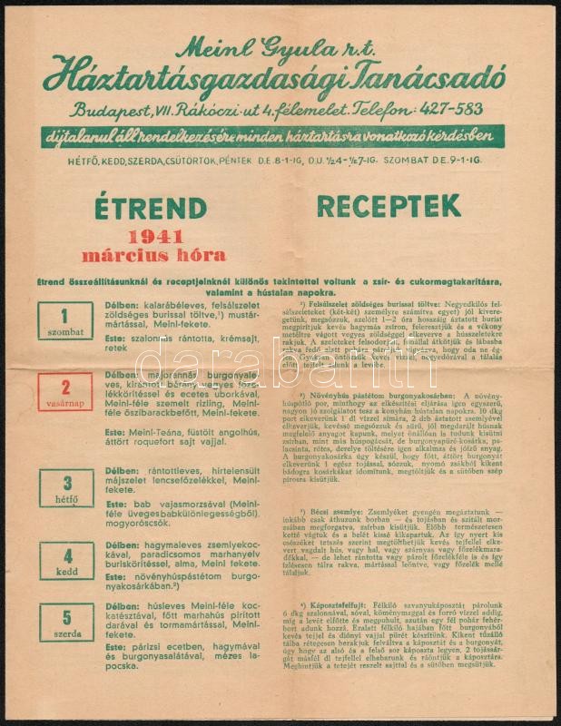 1941 A Meinl Gyula Rt. Háztartásgazdasági Tanácsadójának étrendje, rec... https://www.darabanth.com/de/290-Fernauktion/290.0/Andere-Sammelgebiete/Drucksachen~100028/1941-A-Meinl-Gyula-Rt-Haztartasgazdasagi-Tanacsadojanak-etrendje-receptekkel-kis-szakadas~II1530807