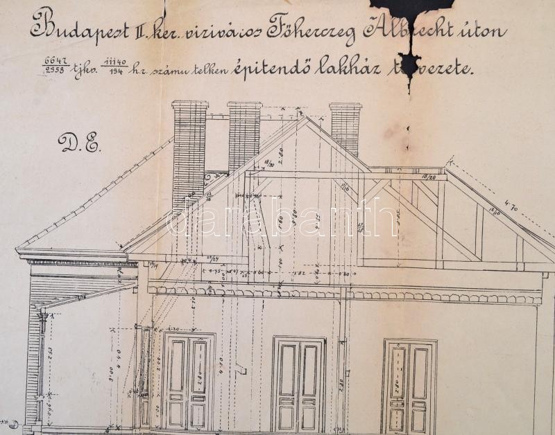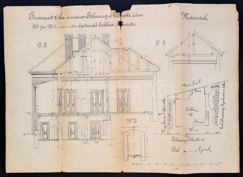 cca 1870-1890 Lukse-Fábry Béla (1844-1915) által tervezett Főherceg Albrecht úti lakóház tervrajza, a hajtások mentén szakadással és némi hiánnyal, 43x59 cm.