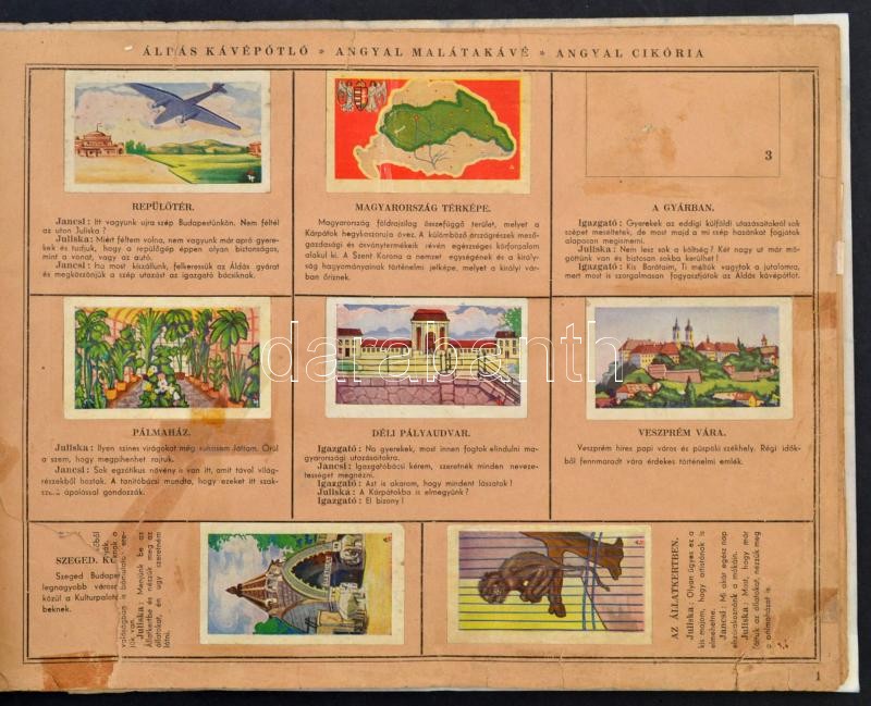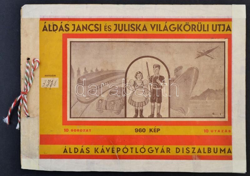 cca 1935 Áldás Jancsi és Juliska világ körüli útja, Áldás Kávépótló Gyár díszalbuma beragasztott címkékkel, összesen 89 db képpel, 3 hiánnyal. Javított, sérült állapotban.