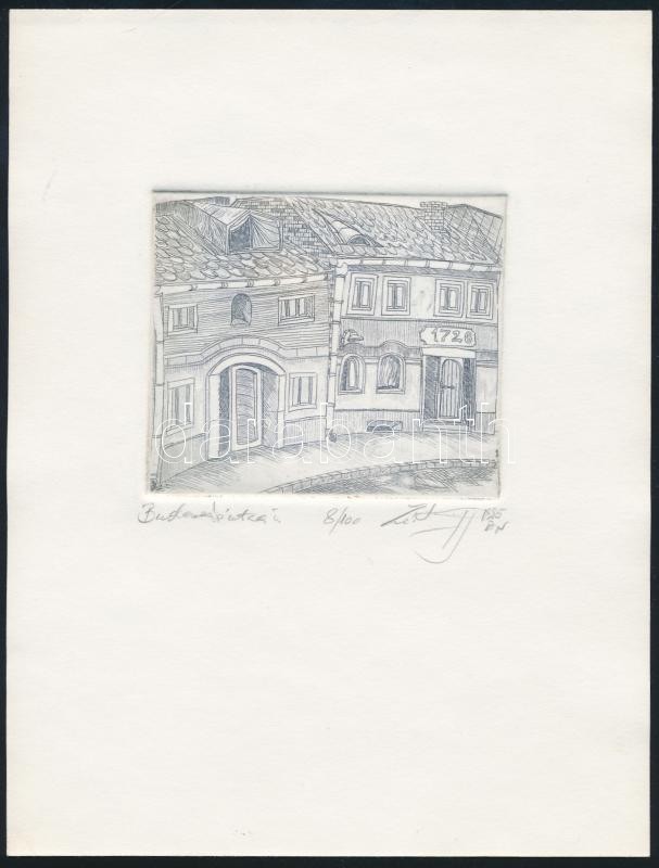 Beschreibung: Olvashatatlan jelzéssel: Budavári utca, rézkarc, papír, számozott (8/100), 6,5×7,5 cm