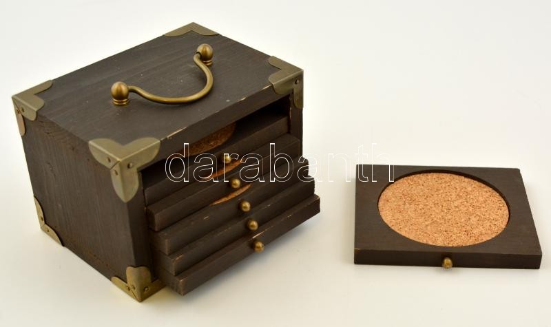 Beschreibung: 6 db poháralátét, fa tartóládában, réz díszítéssel, 8x11,5x8,5 cm