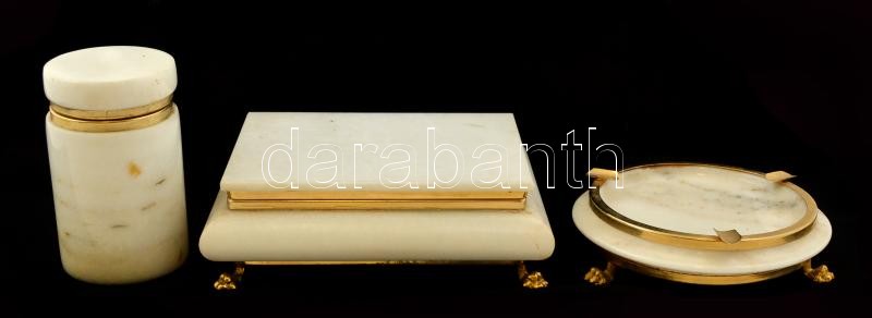 Beschreibung: Alabástrom asztali szett: hamutartó, dobozka, tégely, réz szerelékekkel, kis kopásokkal, különböző méretben, összesen 3 db