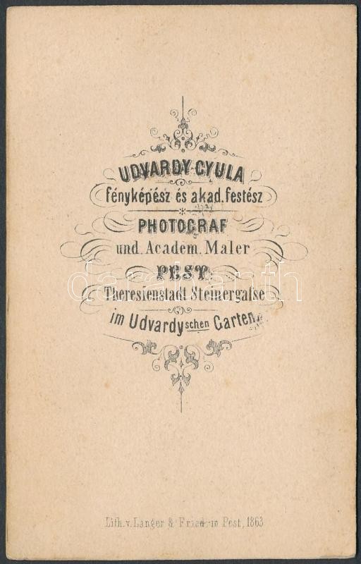 Beschreibung: cca 1862 Udvardy Gyula fényképész és akad. festész pesti műtermében készült, vizitkártya méretű fénykép, 10,5x6,5 cm