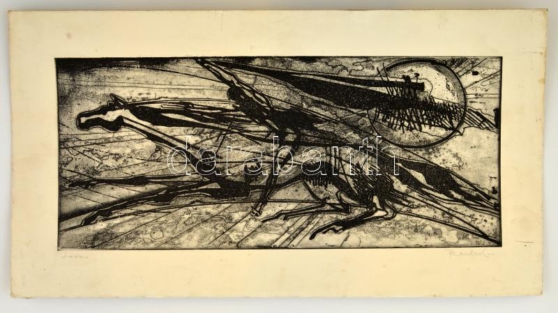 Beschreibung: Raszler Károly (1925-2005): Lovas, rézkarc, papír, jelzett, 21×48,5 cm