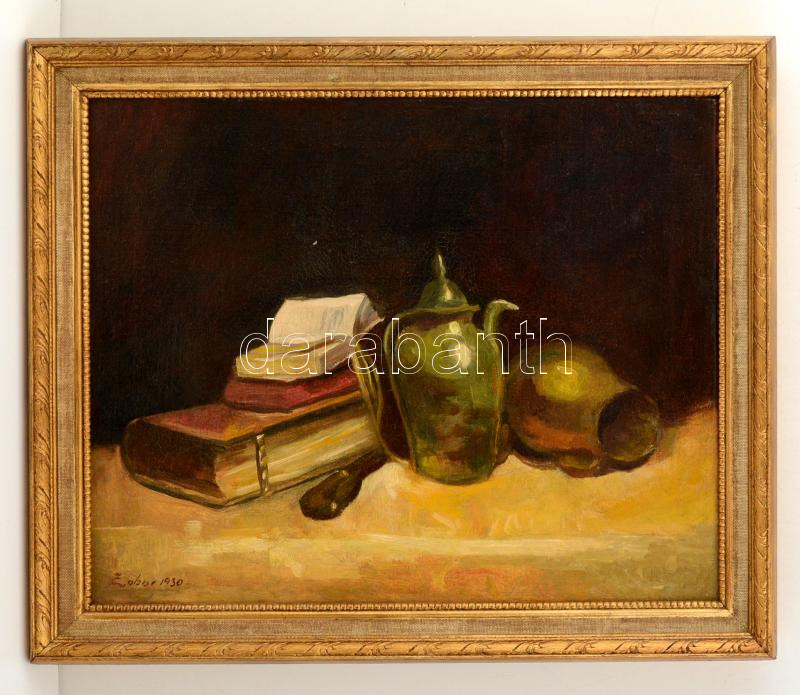 Beschreibung: Zobor Jenő (1898-?): Asztali csendélet. Olaj, vászon, jelzett, keretben, 40×50 cm
