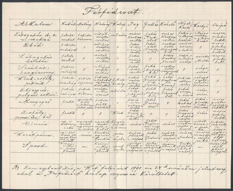 1900 Alkalmi öltözködési tanácsadó férfiaknak. Kézzel írt táblázat. 21... https://www.darabanth.com/de/290-Fernauktion/290.0/Andere-Sammelgebiete/Historische-Dokumenten-Handschriften~100018/1900-Alkalmi-oltozkodesi-tanacsado-ferfiaknak-Kezzel-irt-tablazat-21-x-18-cm~II1532953
