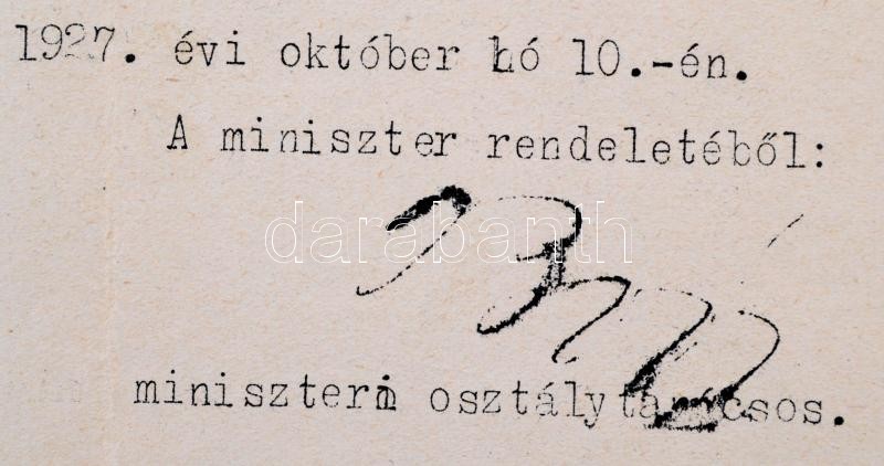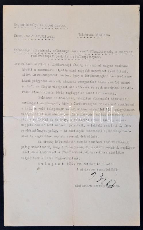 1927 Magyar királyi belügyminiszter utasítása a Törökországból hazatért magyar munkások megfigyelésére, miniszteri osztálytanácsos sokszorosított aláírásával, kis szakadással. 34x21 cm