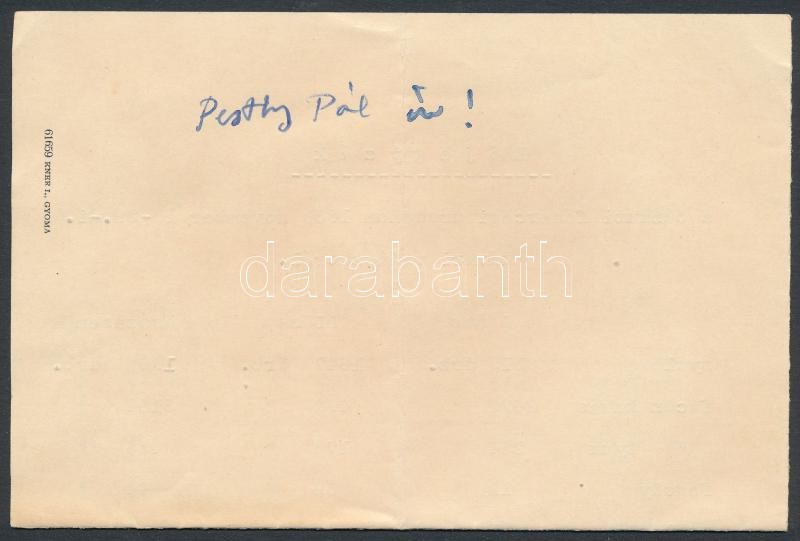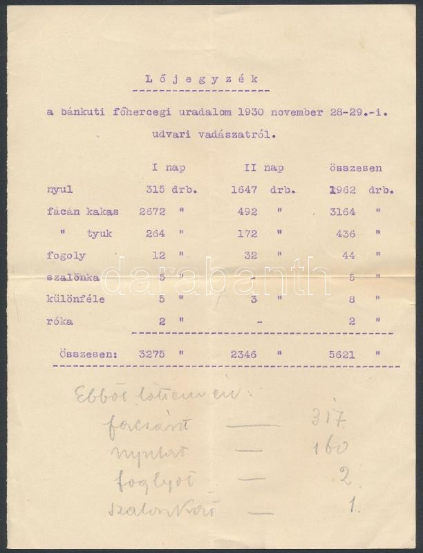 1930 Lőjegyzék a bánkúti főhercegi uradalom vadászatáról, Pesthy Pál igazságügyminiszter példánya, rajta az általa elejtett vadak felsorolásával