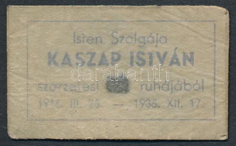 cca 1935 Ereklye, Kaszap István (1916-1935) jezsuita novícius szerzete... https://www.darabanth.com/de/290-Fernauktion/290.0/Andere-Sammelgebiete/Historische-Dokumenten-Handschriften~100018/cca-1935-Ereklye-Kaszap-Istvan-1916-1935-jezsuita-novicius-szerzetesi-ruhajanak-egy-darabja-~II1528891