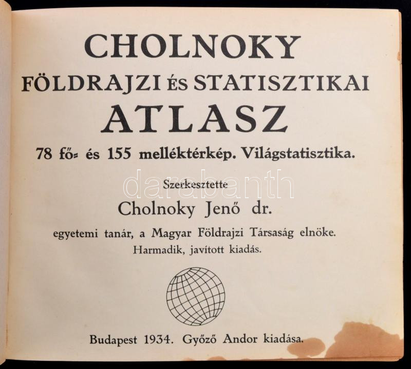 Dr. Cholnoky Jenő (szerk.): Földrajzi és statisztikai atlasz. 78 fő és 155 melléktérkép, világstatisztika. Bp., 1934, Győző Andor. Harmadik, javított kiadás. Átkötött félvászon-kötés, a címoldal kicsit foltos, de egyébként jó állapotban.