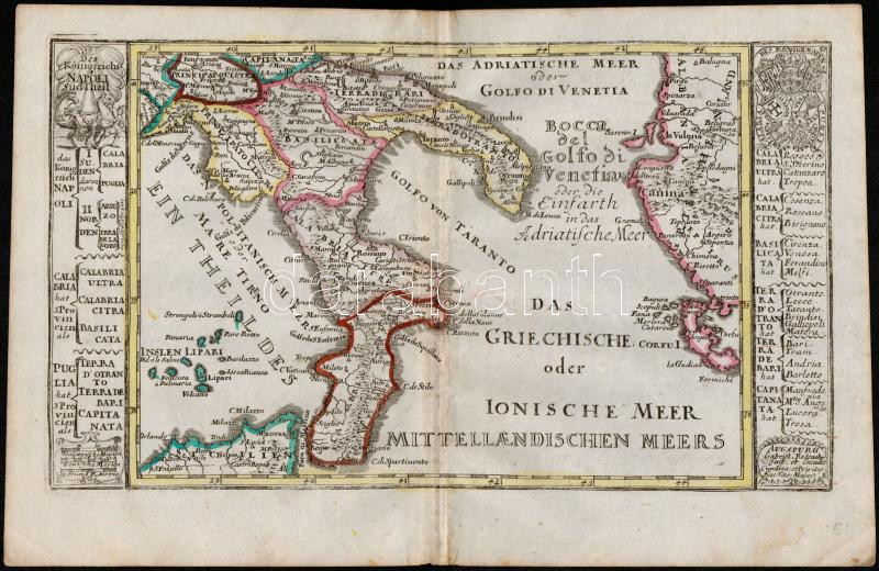cca 1700 A Nápolyi Királyság térképe. Színezett, díszes kartusú rézmetszet. Megjelent: Johann Hofmann Atlas Curieux oder neuer und Compendieuser Atlas. (Augsburg, 1700). Méret: 29x20 cm / cca 1700 Map of Kingdom of Napoli, Italy. Colored etching 31x20 cm