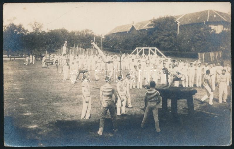 1913 Hajmáskér, Tornázó katonák, futott fotólap, 9x14 cm https://www.darabanth.com/de/290-Fernauktion/290.0/Andere-Sammelgebiete/Militaria~100026/1913-Hajmasker-Tornazo-katonak-futott-fotolap-9x14-cm~II1531058