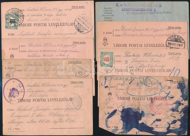Beschreibung: 1914-1918 Tábori Postai Levelezőlapok, 20 db, bélyegzőkkel, 2 db 10 filléres bélyeggel, változó állapotban,