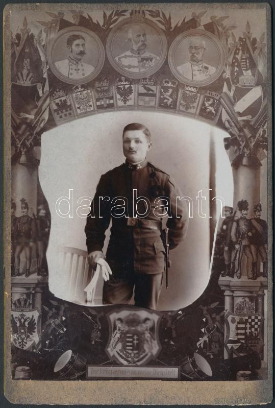 cca 1900 Katonatisztportré, keményhátú fotó, Walter Tausch (Sarajevo), címerekkel, felül középen Ferenc Józseffel, két oldal osztrák-magyar főtisztekkel, 15x10 cm
