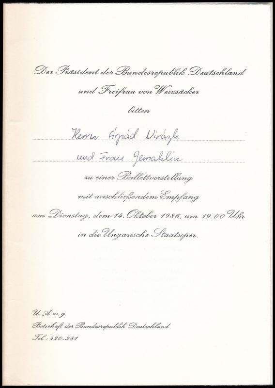 1986 Német Szövetségi Köztársaság elnökének, Richard von Weizsäcker (1920-2015) aláírása balettelőadás meghívóján / signature of Richard von Weizsäcker (1920-2015) President of the Federal Republic of Germany