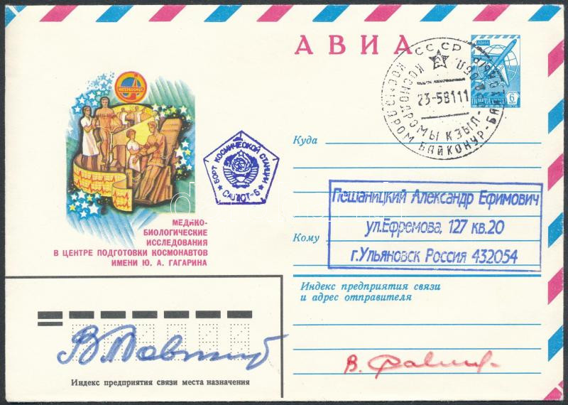 Vlagyimir Kovaljonok (1942- ) és Viktor Szavinih (1940- ) szovjet űrhajósok aláírásai emlékborítékon /