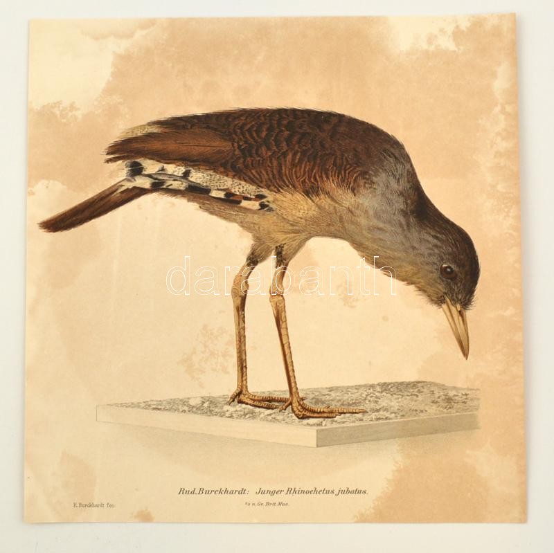Beschreibung: Burckhardt, Karl Rudolf (1866-1908) nyomán: Fiatal kagu (Rhynochetos jubatus), színezett acélmetszet, papír, feliratozva, foltos, 23×22,5 cm