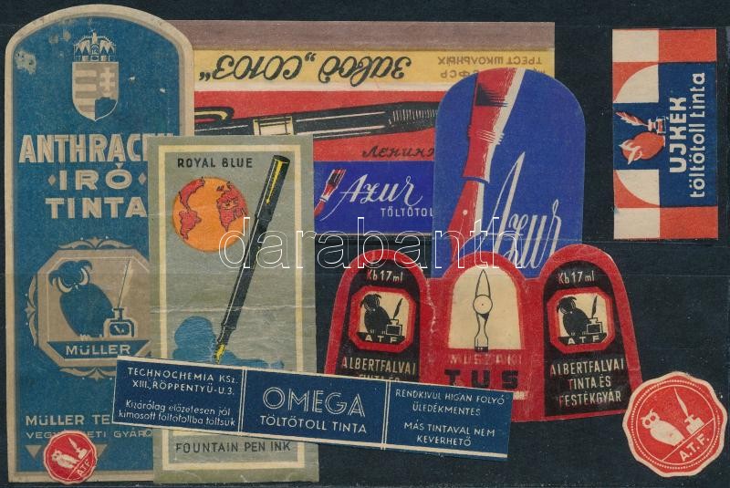 Beschreibung: 10 db Különféle írószer, tinta címke, köztük 3 db Albertfalvai Tinta és Festékgyár (A.T.F.), és 1 db Müller Testvérek, 1 db Ujkék töltötoll tinta